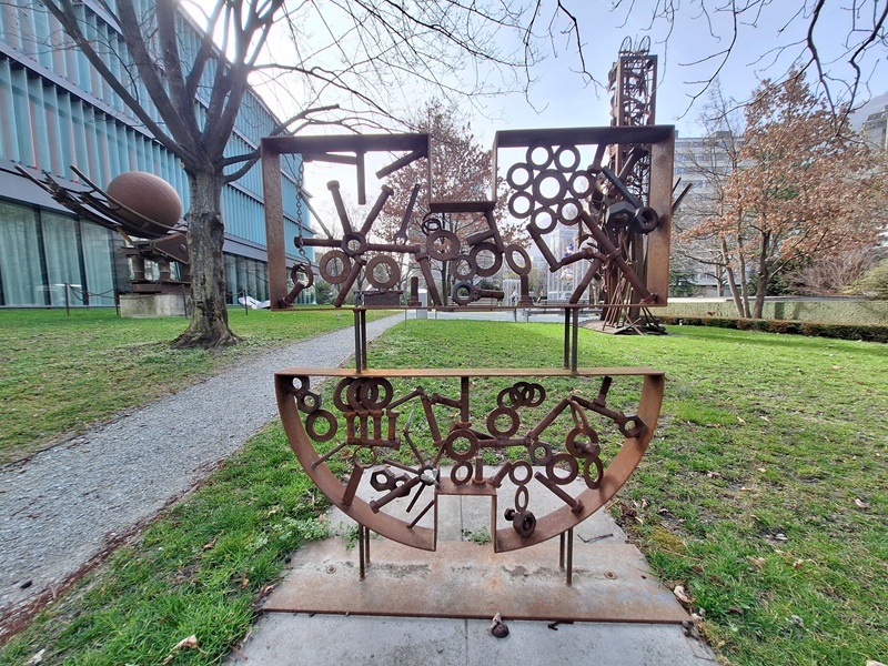 Zu sehen sind dort seit 2007 auf über 1.000 Quadratmetern Gartenfläche Werke von fünf renommierten Künstlerinnen und Künstlern. Dazu zählen Werke von Niki de Saint Phalle, wobei natürlich ihre berühmten Nana-Figuren, jene farbigen, mit großen Busen und breiten Hüften ausgestattete Frauenskulpturen, nicht fehlen dürfen (im Winterhalbjahr sind sie "eingekastelt", damit Schnee und Eis ihnen nichts anhaben kann). Auch ihr Gatte, Jean Tinguely, ist hier vertreten. Der bereits 1991 verstorbene Schweizer Künstler ist für seine beweglichen maschinenähnlichen Skulpturen, teils als Wasserspiele angelegt, bekannt. Und eine ebensolche steht auch hier. Zu entdecken gibt es zudem die eidgenössischen Carlo Borer, Bernhard Luginbühl und Not Vital – alle mir bis dato unbekannt. Aber man lernt ja nie aus, wenn man offen ist für Neues.