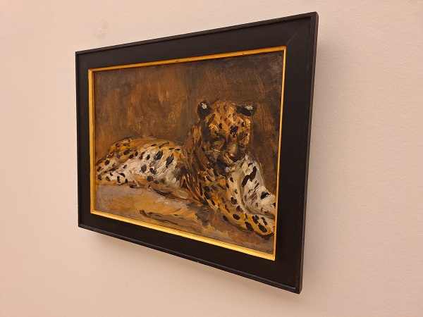 Wer kurz darauf (nicht nur) den Saal der vor kurzer Zeit neu gehängten "Moderne" betritt, kommt an einer kleinen Stele vorbei, die schmale Kunstkärtchen enthält. Das erscheint auf den ersten Blick Old-Style und ist doch gekonnt interaktiv. Die Kärtchen erinnern an Lesezeichen und sind doch mehr: die Aufforderung zu kunstvollen Entdeckungen anhand von Bildausschnitten. Auch ein Slevogt-Motiv findet sich darunter, der "Liegender afrikanischer Leopard" von 1901, der hier als Aufmacher dient.